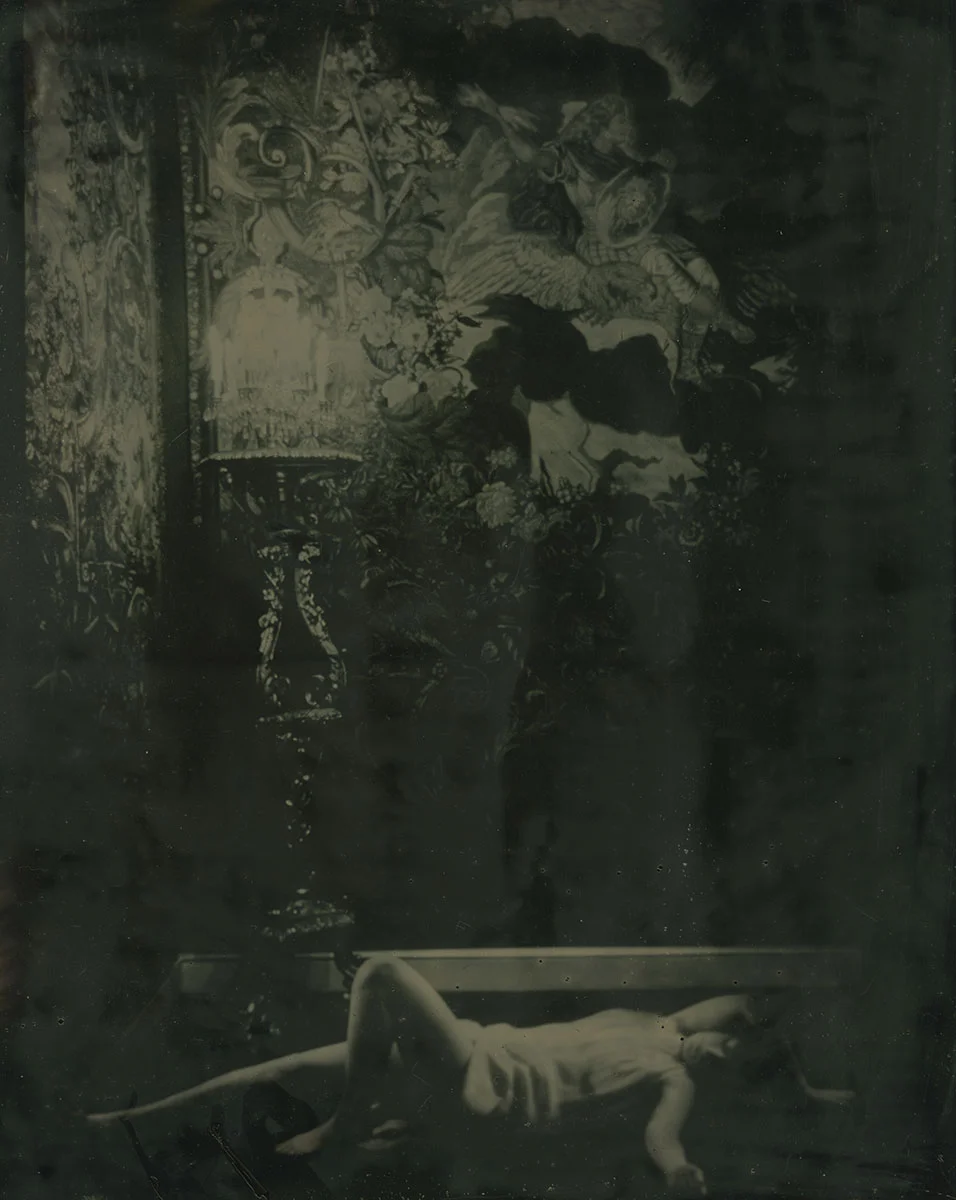 The woman depicted in the image is an allegory, or ghost, of an emotional state of being. The female form has been digitally composited into a space which lies in permanent untouched stasis: the curated period room in the collection of the Metropolitan Museum of Art. These spaces, and the furnishings contained within them, have lived extensive lives. They now lie quiet, waiting for the next entity or energy to fill the void. Each space embodies the vitality of the residents, patrons, and visitors who once owned, touched, and interacted with the furnishings. The empty space now years for an emotional interloper to recharge the vacant atmosphere.
